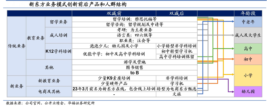 經(jīng)典案例:根據(jù)公司官網(wǎng)、公開業(yè)績會、華福證券研究會等綜合資訊表明,新東方新業(yè)務(wù)中電商和文旅部分,則是以新東方大 IP 為基礎(chǔ),迎合學(xué)生及家長的多層次需求,向上進行年齡層的延伸,一方面直接為公司貢獻增量業(yè)績,另一方面助力集團進行商業(yè)版圖的擴張。
