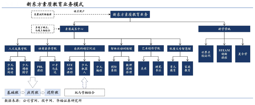 經(jīng)典案例:根據(jù)公司官網(wǎng)、投中網(wǎng)、華福證券研究會等綜合資訊表明,新東方素質(zhì)教育的業(yè)務(wù)分為素質(zhì)成長中心和游學(xué)營地兩大板塊,提供豐富多樣的教學(xué) 內(nèi)容,創(chuàng)新教育模式,旨在培養(yǎng)孩子的多元化能力。其中的素質(zhì)成長中心結(jié)合線上線下 模式,通過免費試聽課程吸引顧客,包括人文發(fā)展學(xué)院、語商素質(zhì)學(xué)院、自然科創(chuàng)空間站、智體運動訓(xùn)練館、藝術(shù)創(chuàng)作學(xué)院和優(yōu)質(zhì)父母智慧館六大領(lǐng)域。