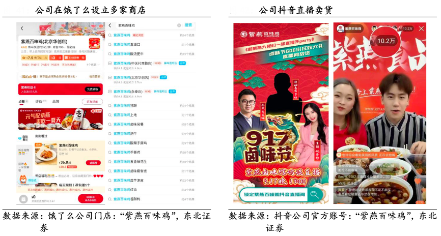 經(jīng)典案例:根據(jù)餓了么公司門店:“紫燕百味雞”、抖音公司官方帳號:“紫燕百味雞”、東北證券等綜合資訊表明,紫燕食品公司積極開辟外賣平臺、O2O 平臺的線上渠道。隨著外賣的普及化,公司也與美團、 餓了么等外賣平臺達成合作,在平臺上開設線上門店,讓顧客無時無刻都能享有新鮮紫燕鹵制品。