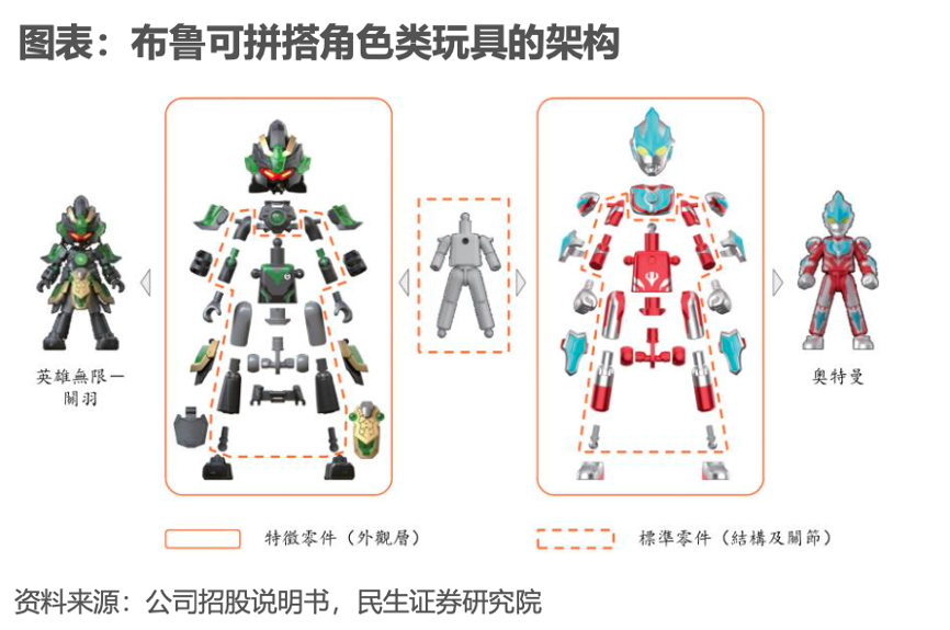 經(jīng)典案例:根據(jù)公司招股說明書、民生證券研究院等綜合資訊表明,布魯可的拼搭角色類玩具從人體結(jié)構(gòu)中汲取靈感,以實(shí)現(xiàn)穩(wěn)定性、可動(dòng)性和外觀的模仿。通過標(biāo)準(zhǔn)零件和特征零件的組合,布魯可能夠還原出具有高度定制性和細(xì)節(jié)的角色。