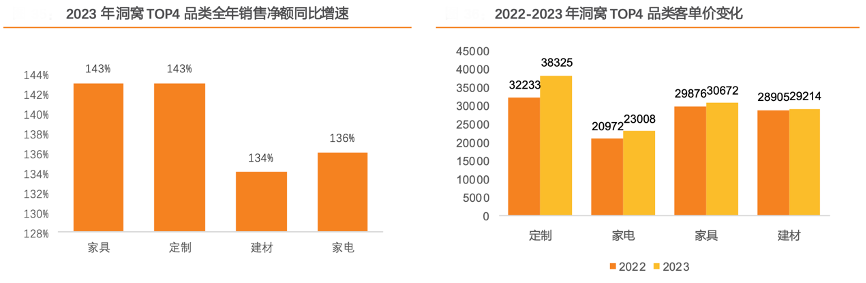 經(jīng)典案例:根據(jù)公司年報(bào)、天風(fēng)證券研究所等綜合資訊表明, 2022-2023 年洞窩整體銷售凈額從 346 億元提升至 974 億元,主要得益于洞窩廣泛滲透以及用戶規(guī)模和商品豐富度快速提升。拆分量價(jià)來看,2022-2023 年洞窩客單價(jià)從 3.7 萬元提升至 4.1 萬元、客單量從 2.4 單提升 至 2.6 單,均增長約 10%,主要系憑借線上線下相結(jié)合的新購物場景帶來了服務(wù)體驗(yàn)升級(jí)。