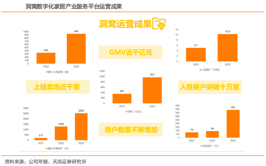 經(jīng)典案例:根據(jù)居然之家洞窩數(shù)據(jù)、艾瑞咨詢、公眾號(hào)家居新范式、天風(fēng)證券研究所等綜合資訊表明,洞窩成立于2020 年12月,依托居然之家的產(chǎn)業(yè)背景 和平臺(tái)資源打造 ,通過聚焦產(chǎn) 業(yè)鏈上 下游的 數(shù)字化 賦能、線 上線下 一體化 全場景 零售、跨 境電商三大核心業(yè)務(wù),全鏈路賦能品 牌工廠 、經(jīng)銷 商和賣場。截至 2023 年底洞窩累計(jì)上線賣場已達(dá) 934 家,同比增長 173.1%;入駐商戶超過 10 萬家。