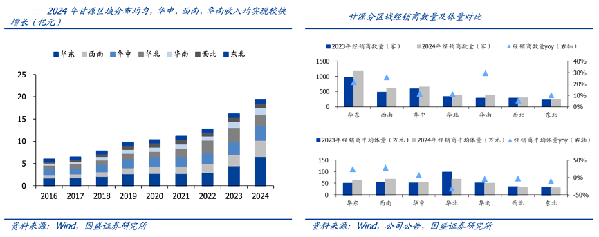 經(jīng)典案例:根據(jù)wind、公司公告、國(guó)盛證券研究所等綜合資訊表明,甘源公司線下經(jīng)銷團(tuán)隊(duì)擴(kuò)容,推動(dòng)營(yíng)收高增長(zhǎng)。從區(qū)域來看,2024 年公司華東/西南/華中/華北/ 華南/西北/東北分別實(shí)現(xiàn)收入 6.6/3.7/3.4/2.3/1.6/1.0/0.7 億元,2020-2024 年 CAGR 分 別為 24.2%/21.9%/12.2%/18.5%/14.0%/1.3%/0.6%。