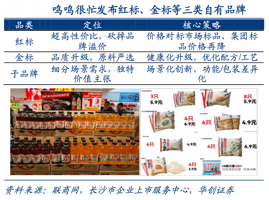 經(jīng)典案例:根據(jù)聯(lián)商網(wǎng)、長(zhǎng)沙市企業(yè)上市服務(wù)中心、華創(chuàng)證券等綜合資訊表明,零食量販在前期高性?xún)r(jià)比品牌心智逐步形成基礎(chǔ)上,鳴鳴很忙在 25 年初的省錢(qián)大會(huì)上發(fā)布紅標(biāo)、金標(biāo)、子品牌三 類(lèi)自有品牌,其中紅標(biāo)強(qiáng)化性?xún)r(jià)比、金標(biāo)主打品質(zhì)升級(jí)、子品牌瞄準(zhǔn)細(xì)分場(chǎng)景需求。