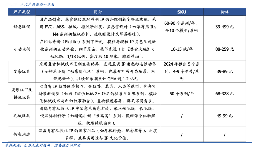 經(jīng)典案例:根據(jù)樂自天成招股書、國盛證券研究所等綜合資訊表明,樂自天成公司依托自有及授權(quán) IP 資源,打造了涵蓋六大品類的玩具產(chǎn)品體系。52TOYS 品牌通過系統(tǒng)化產(chǎn)品布局,已形成包括靜態(tài)玩偶、可動玩偶、發(fā)條玩具、變形機(jī)甲及拼裝玩具、毛絨玩具、衍生周邊在內(nèi)的完整產(chǎn)品矩陣。